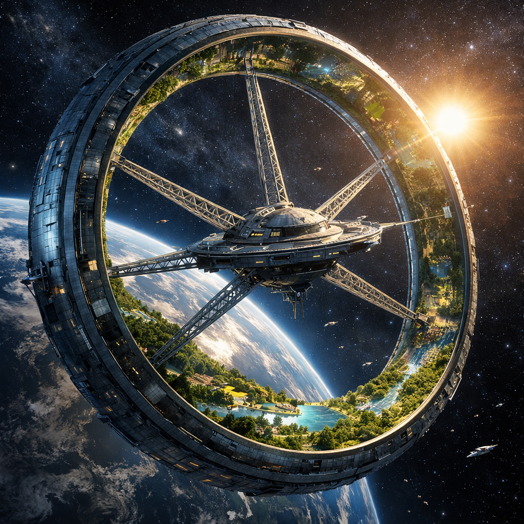 AstraRing is a conceptual 100-kilometer rotating megastructure designed to create artificial gravity through centrifugal force, integrating ecosystems, urban settlements, and large-scale space habitation.