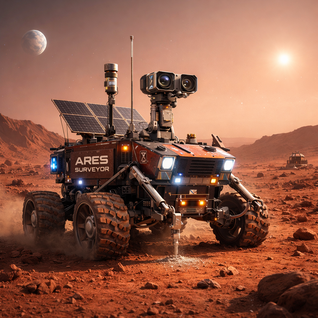 Advanced robotic exploration system deployed to identify stable landing zones, study water-ice deposits, map terrain hazards, and conduct atmospheric analysis in preparation for long-term human habitation under Ares Dominion.