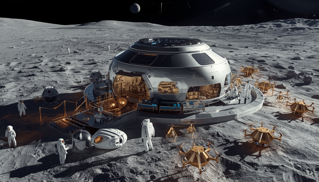 Selene Prime is a permanent lunar base positioned near the Moon’s south pole, enabling resource extraction, radiation-shielded habitation, and serving as a staging ground for deep-space missions.