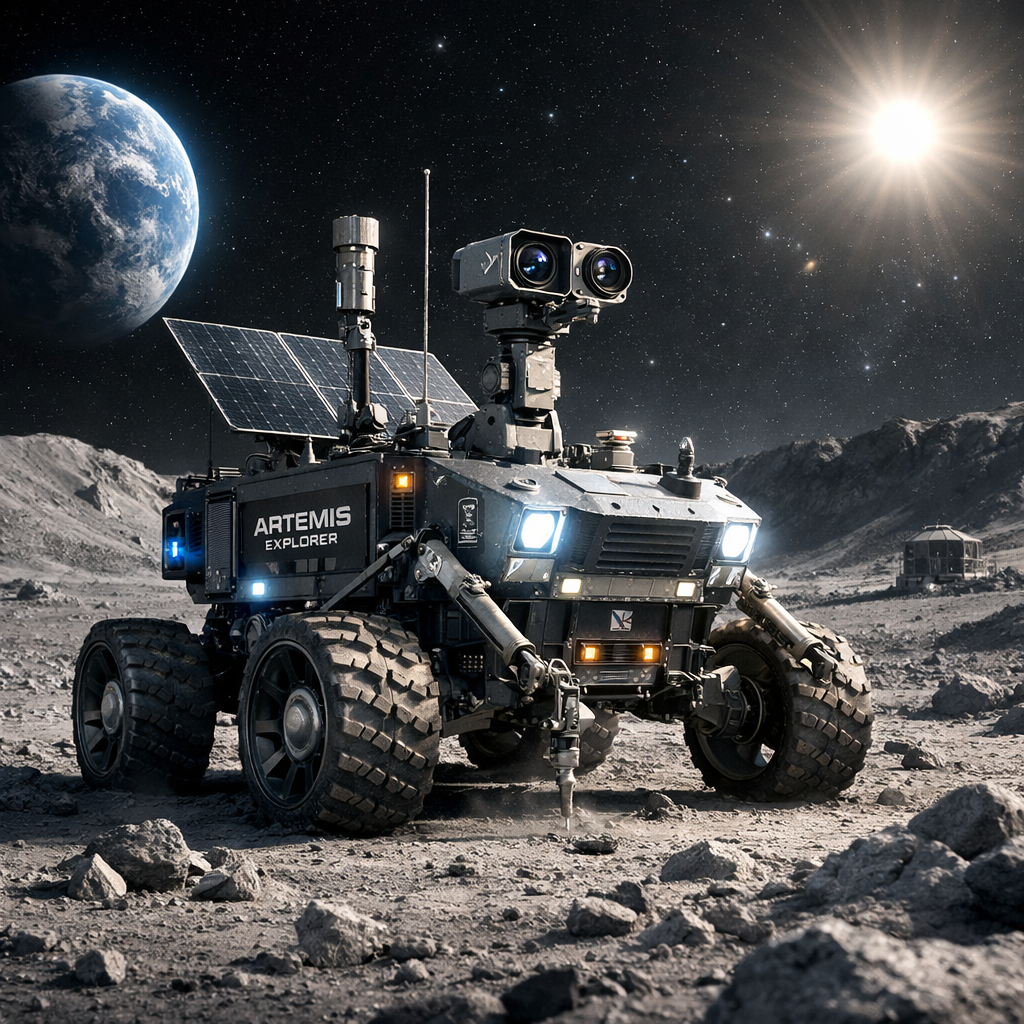 Autonomous lunar rover mission focused on mapping the south pole region, analyzing regolith composition, detecting subsurface ice, and gathering radiation data to support future Selene Prime settlement infrastructure.